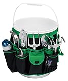 Get organized with the Apollo Tools Bucket Tool Organizer. This Bucket Tool Organizer is made of single layer 600D oxford cloth w/PVC inner layer and will convert your 5 gallon bucket into a tool organizer. It is perfect for keeping your tools organized, protected and easily accessible. With the hook and loop fastener strap it fits any 5 gallon bucket and makes carry tools a breeze. Utilizes 14 inside pockets and 34 triple row outside pockets to hold anything and everything from your garden tools, gloves, seeds, marking sticks, string, scissors, tape , water bottle, and/or cell phone. Made of an extremely durable cloth constructed of PVC coated polyester material that is extremely tear resistant. This material is typically found on products that require abrasion resistance and waterproof characteristics like backpacks, hunting equipment or luggage. Color is Black with green accent. Bucket not included.
