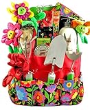 This beautiful arrangement includes a deluxe garden tote filled with a knee cushion, matching 4 pocket garden apron, 3 gardening tools (transplanter, fork and cultivator), a pair of coated gardening gloves, garden hand salve, garden barrier cream, garden hand scrub, 3 plush keepsake flowers with cute little faces and bendy stems to hang onto any surface (very cute!), assorted fruit flavored Bon Bons, Sunny Seed Drops (colorful candy coated chocolate sunflower seeds), Swiss Petite Fruit, Lemon Straw cookies, and delicious Key Lime Straw Cookies.