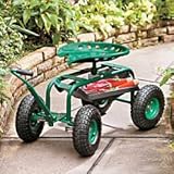 Height-adjustable seat allows you to customize this wheeled garden chair to the perfect height for you. Rolling Garden Seat has a handle and large wheels for easy moving on grass or mulched paths. This wheeled garden chair’s seat swivels 360° for added convenience. Save your back! Use the Rolling Garden Seat with Handle to easily move from one garden chore to the next.We added a collapsible handle and steerable wheels to our popular garden seat, making it even easier to move around your yard. With this wheeled garden chair, not only can you sit comfortably while you work, you can roll your way through your garden to tend to your flowers or pick vegetables. The Rolling Garden Seat features a tractor-style swivel seat (adjustable from 16-1/2″ to 20-1/2″ high) and large pneumatic rubber wheels to make getting around your yard a breeze. This wheeled garden chair also has an easy-to-reach tray under the seat for gardening tools or seed packets. Crafted of sturdy steel, the Rolling Garden Seat has a 250-lb. capacity.Benefits of the Rolling Garden Seat with Handle: This wheeled garden chair’s seat swivels 360 degrees for added convenience