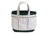White Canvas Tote Made from deluxe washable canvas with green trim and reinforced bottom, this tote features five deep pockets complete with bungee straps to keep the tools in place. A large center cavity makes toting tools, pots and accessories easy. No more running back and forth to the tool shed. Also perfect for picnics, the beach, or any other time you may need to carry a load.